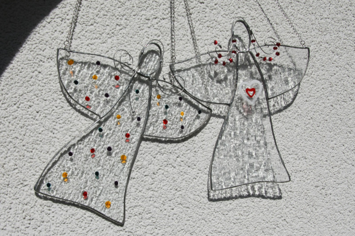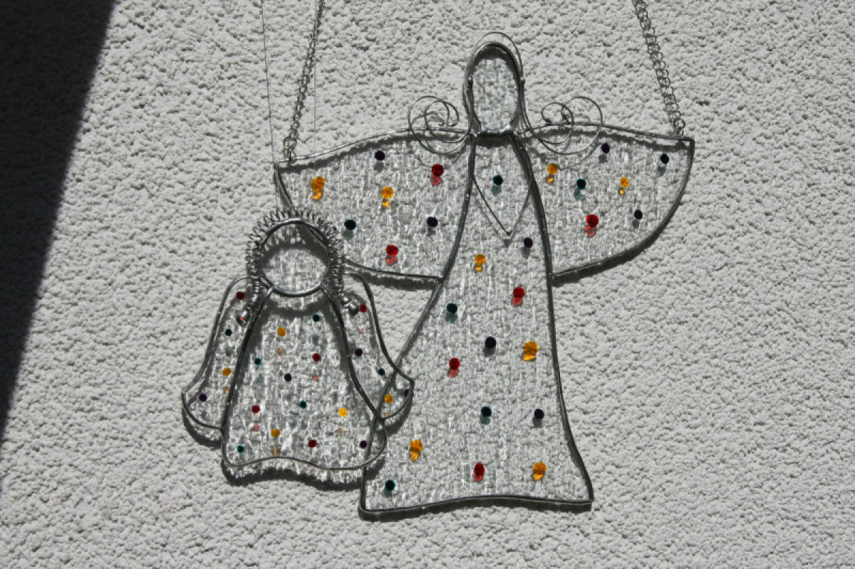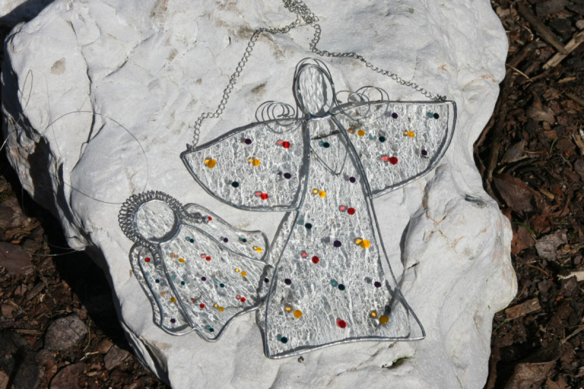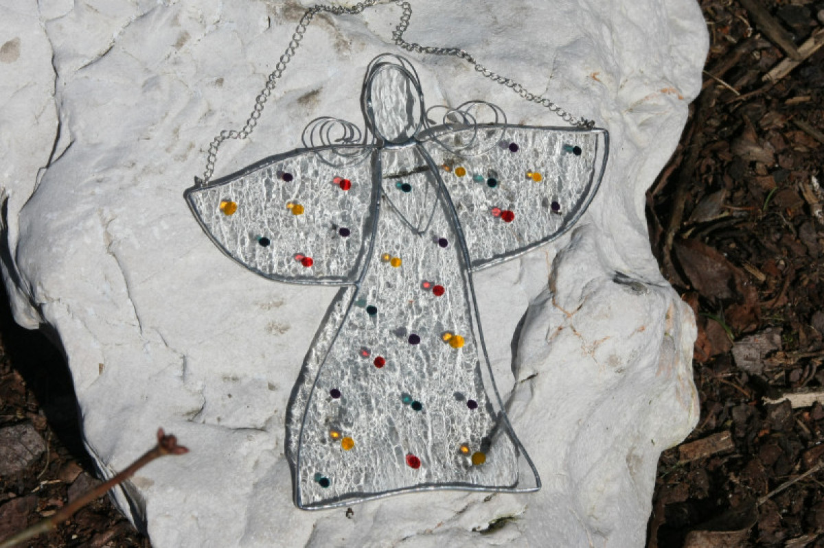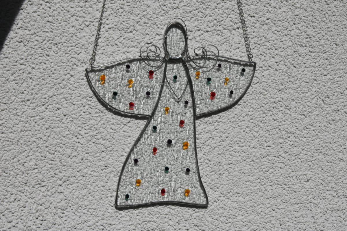 Anděl je zhotoven tiffany technikou z krásného čirého katedrálního skla a opatřen antioxidačním nátěrem. Andílek je ozdoben slabým drátkem a domalován barevnými puntíky.
