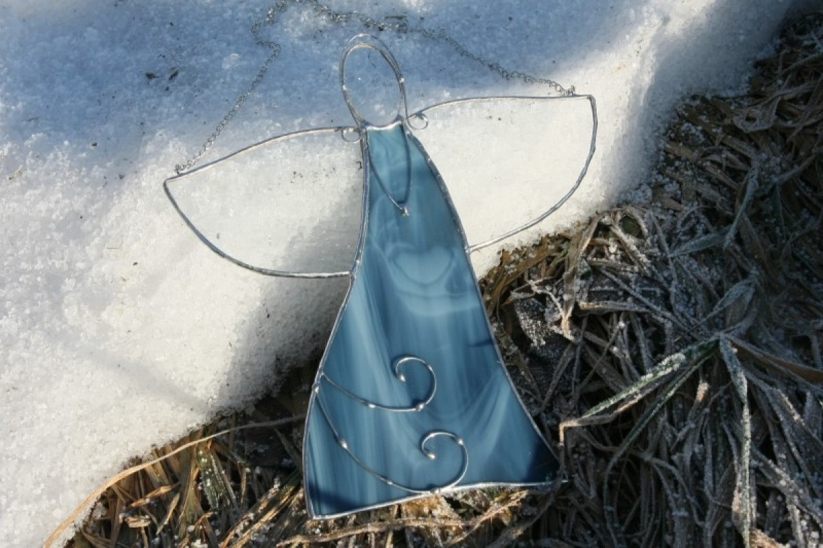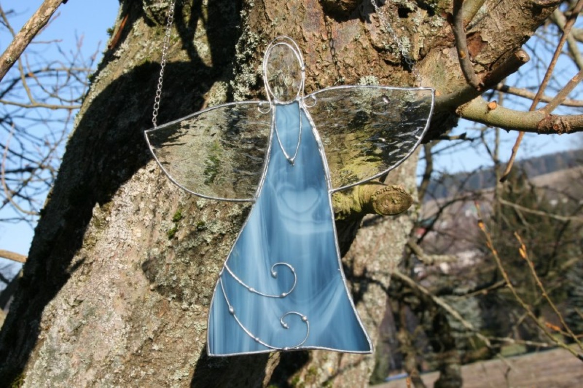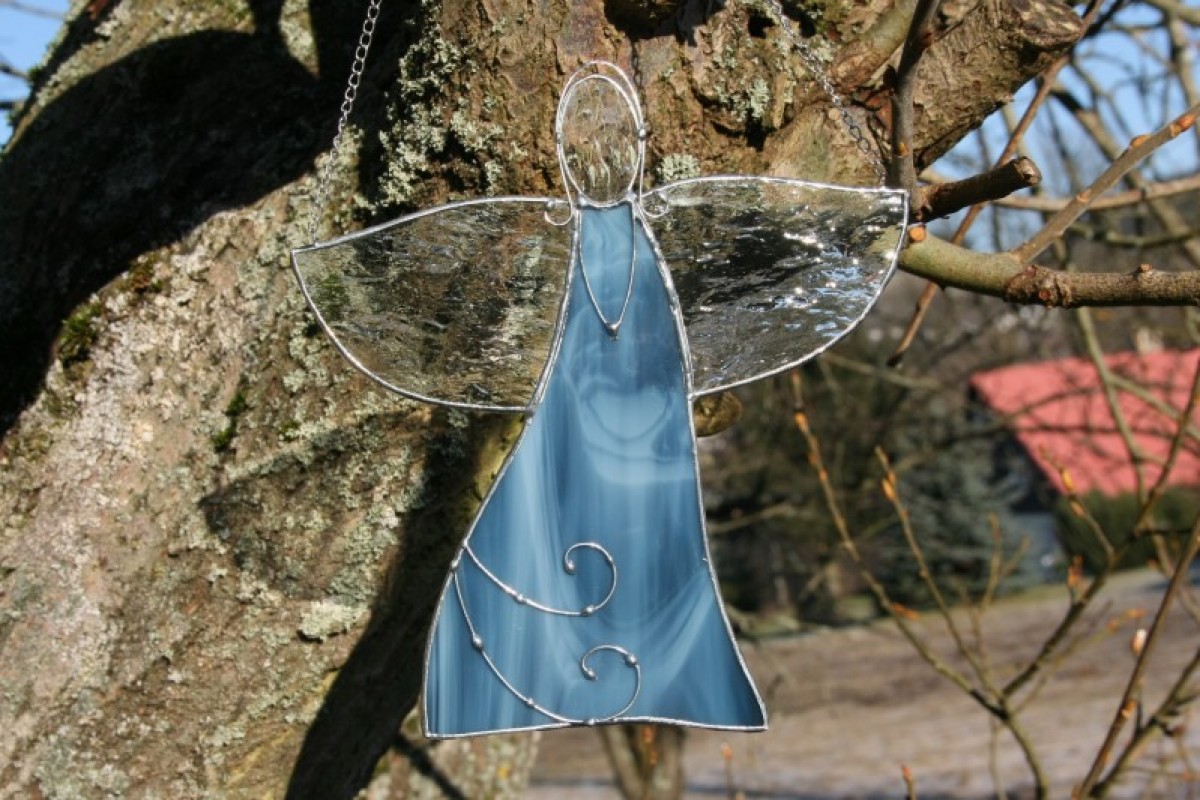 Anděl je zhotoven tiffany technikou z krásného opálového modrého skla, ozdoben drátkem a opatřen antioxidačním nátěrem.