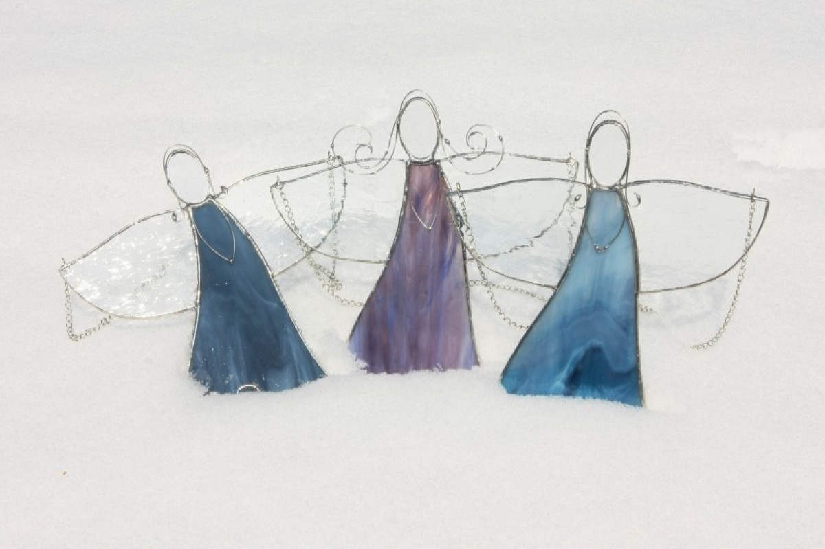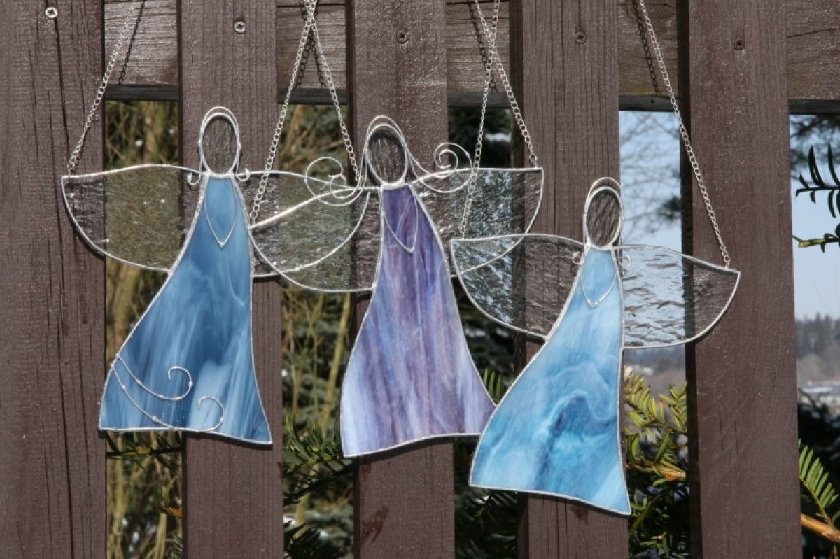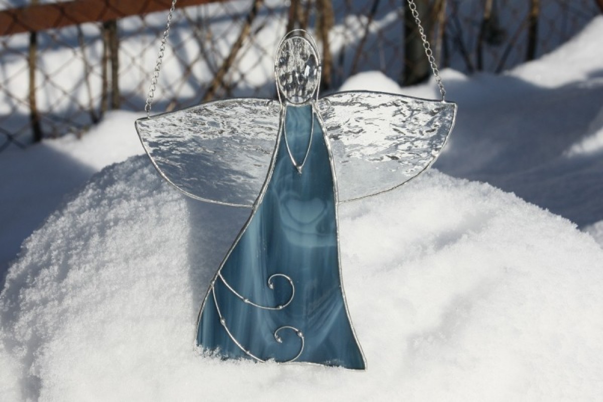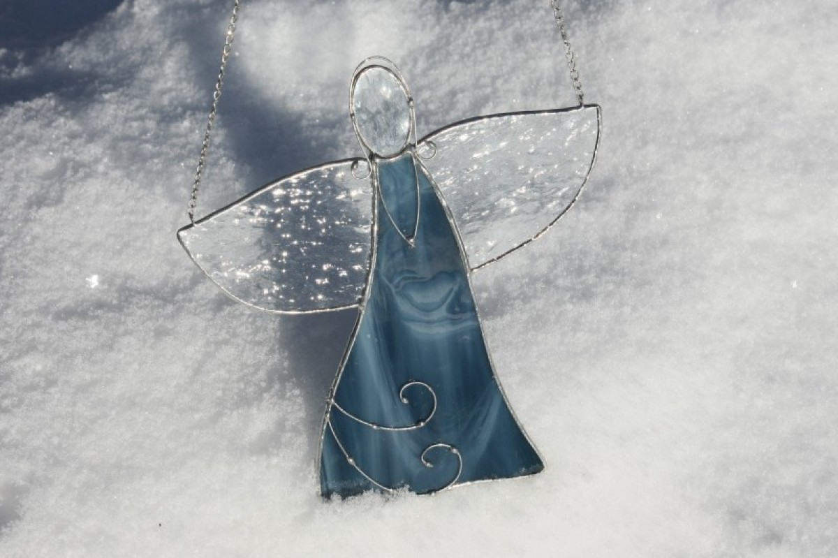 Anděl je zhotoven tiffany technikou z krásného opálového modrého skla, ozdoben drátkem a opatřen antioxidačním nátěrem.