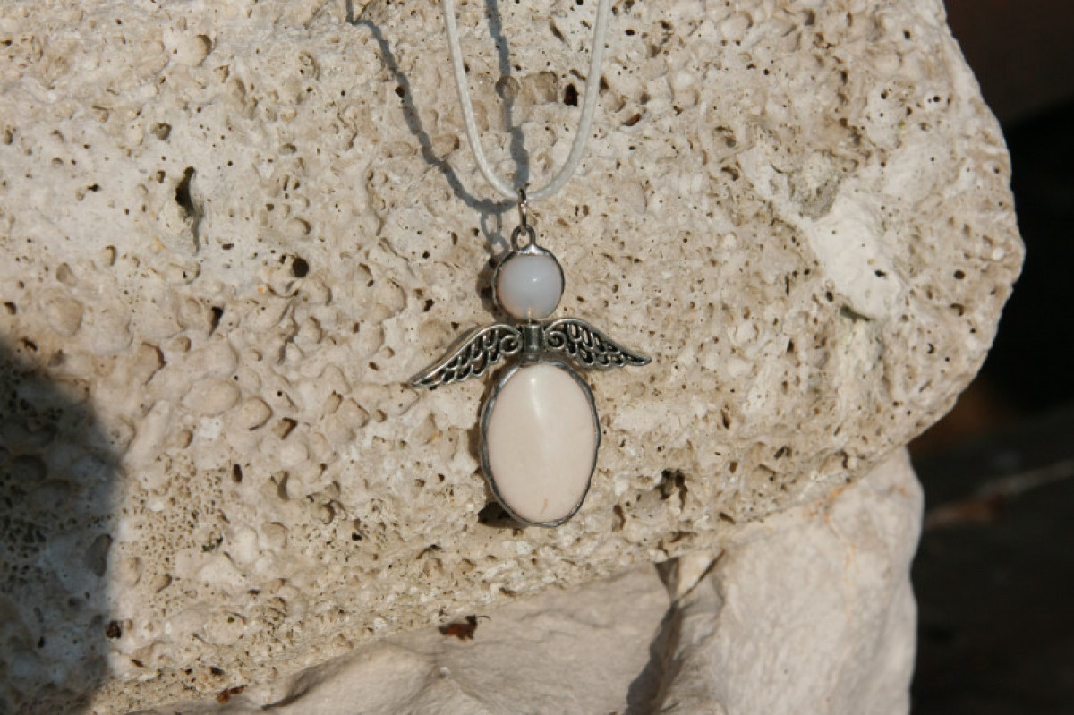 Náhrdelník je zhotoven tiffany technikou z bílého a světle béžového korálku, které jsou spojeny cínem a po obvodu pocínovány. Nakonec je celý šperk opatřen antioxidačním nátěrem.