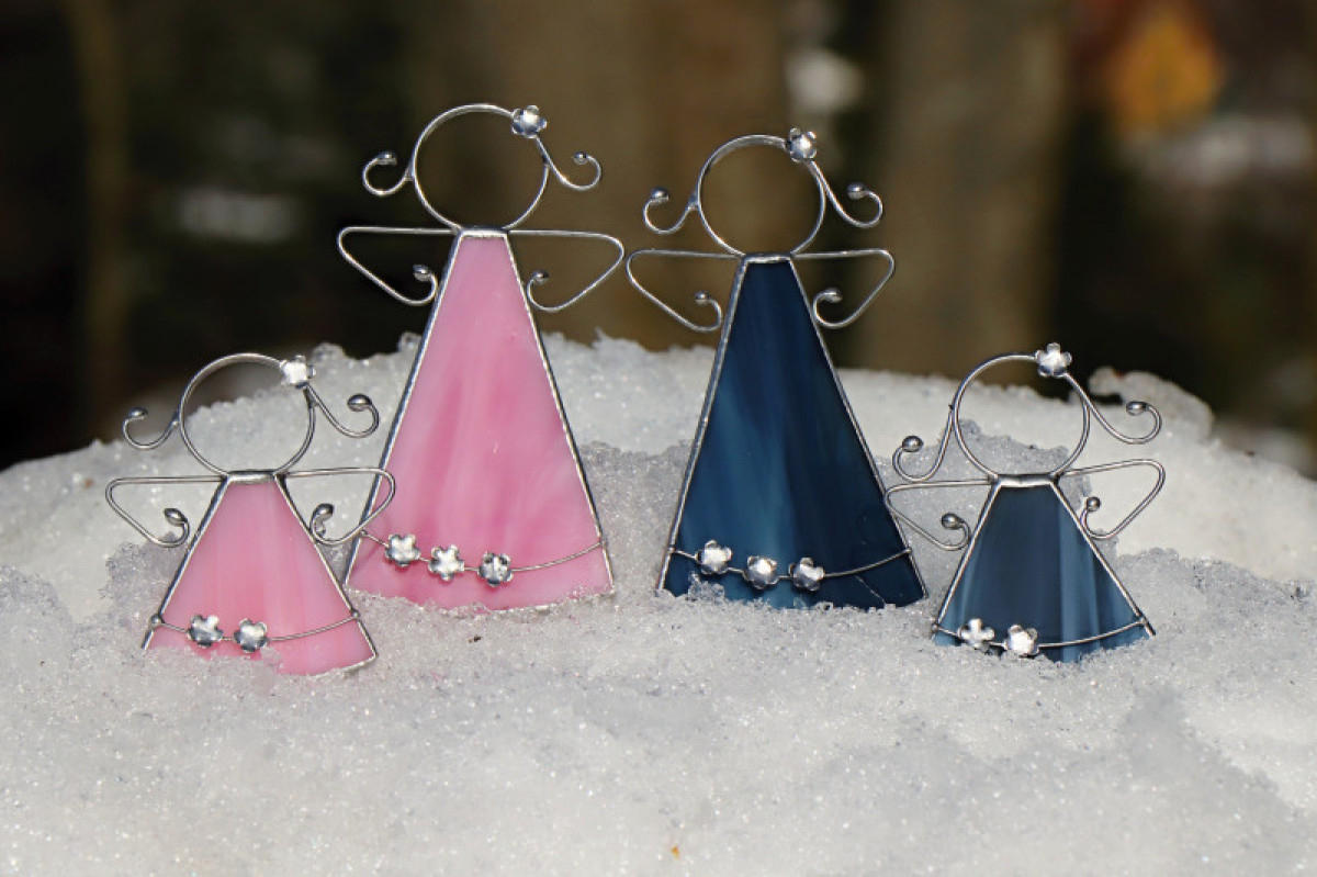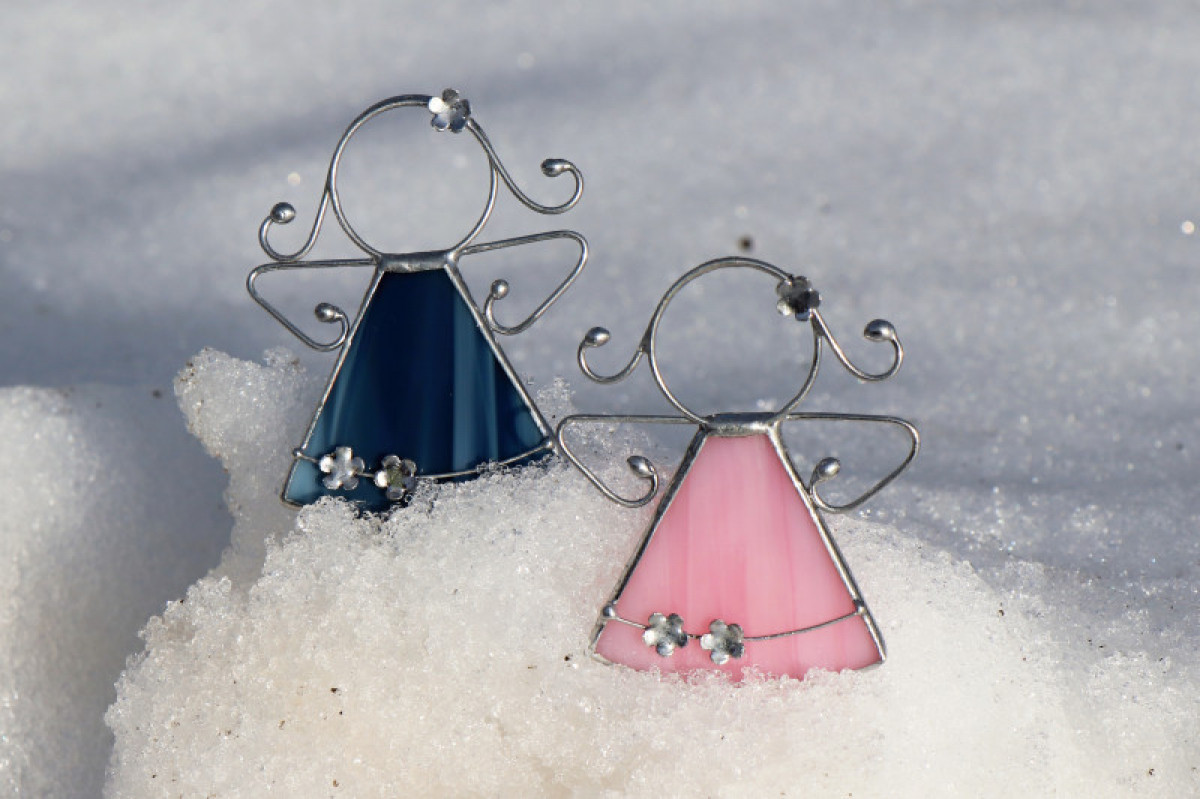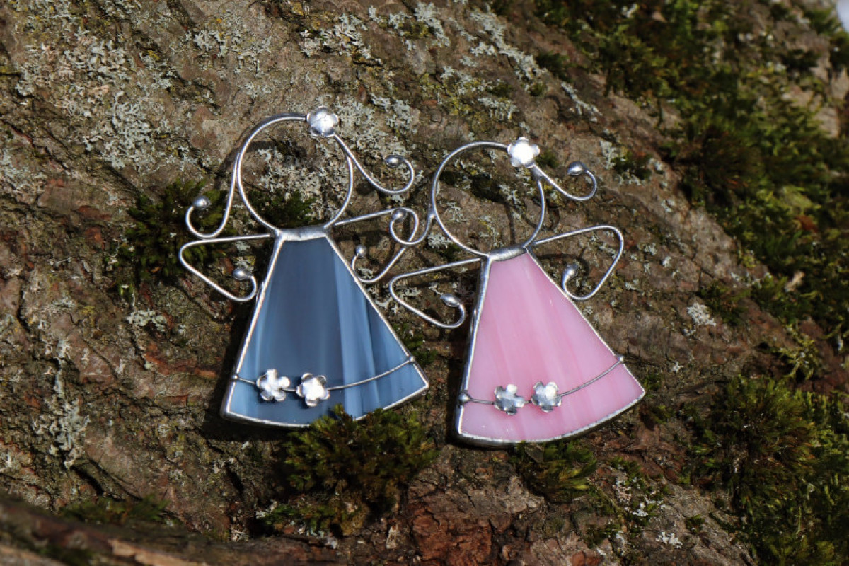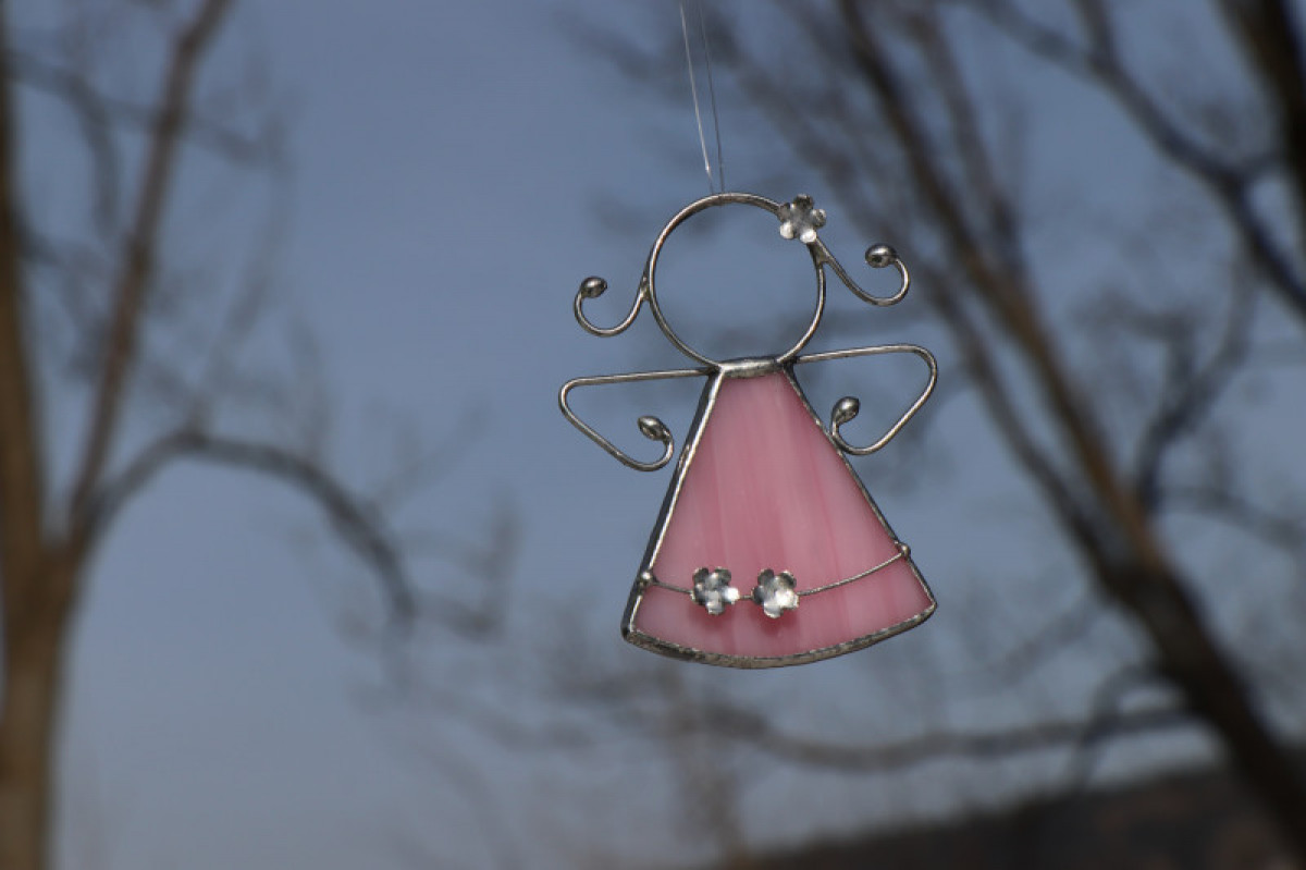 Malý andílek je zhotoven tiffany technikou z krásného opálového růžového skla. Je ozdoben ocínovaným drátkem a kytičkami a opatřen antioxidačním nátěrem.