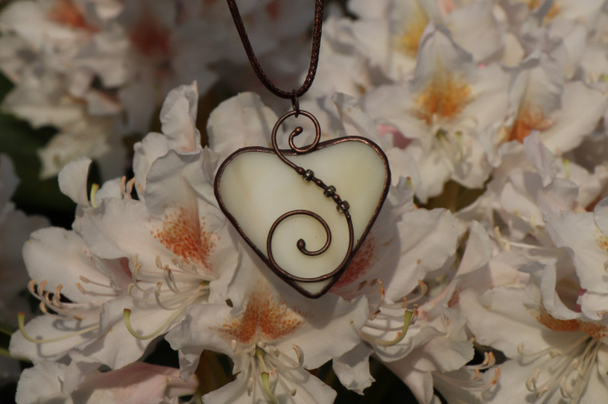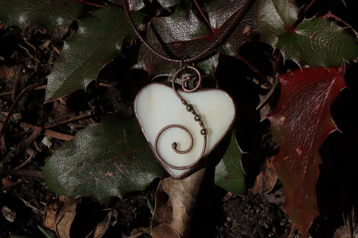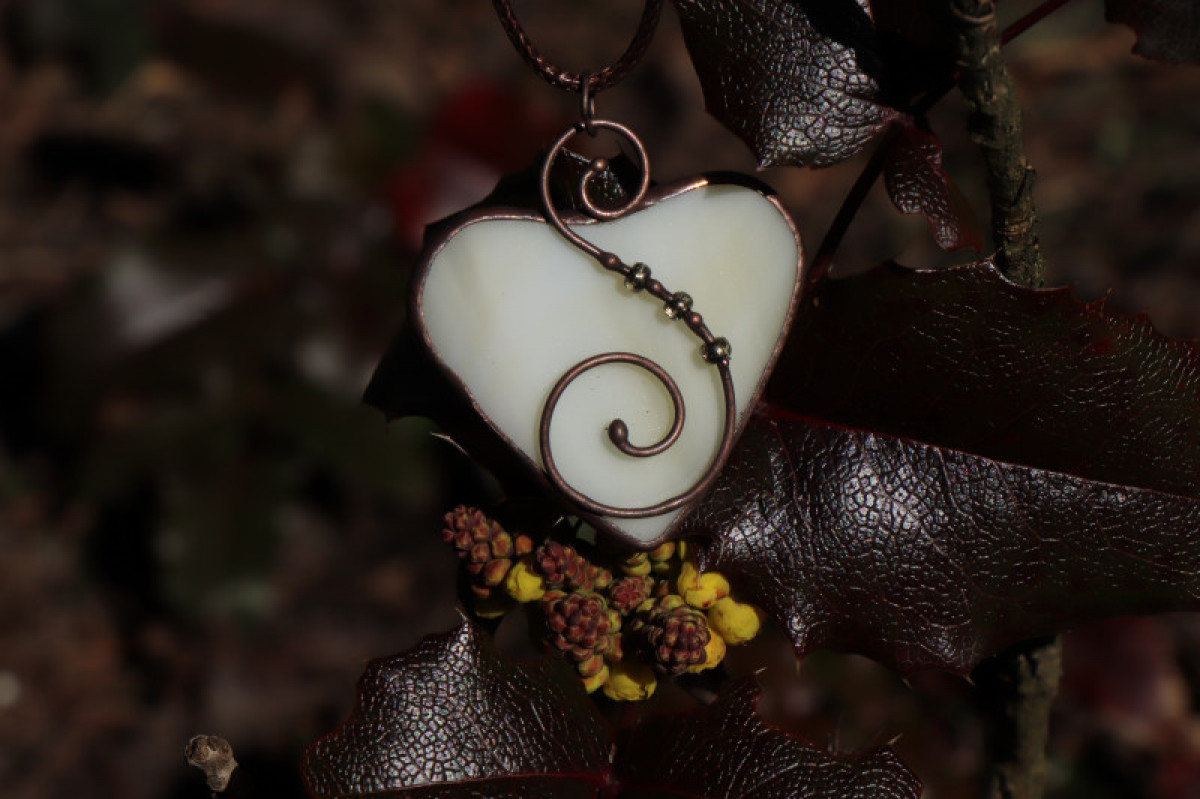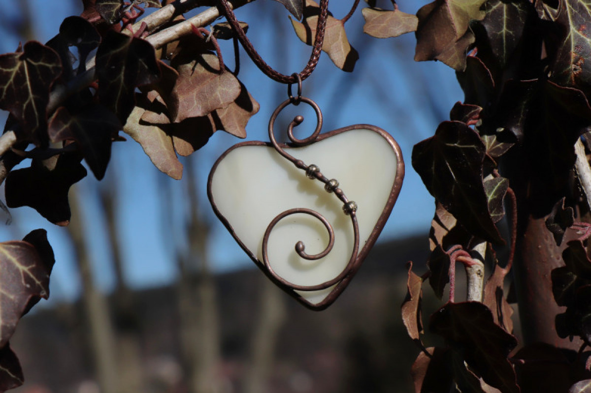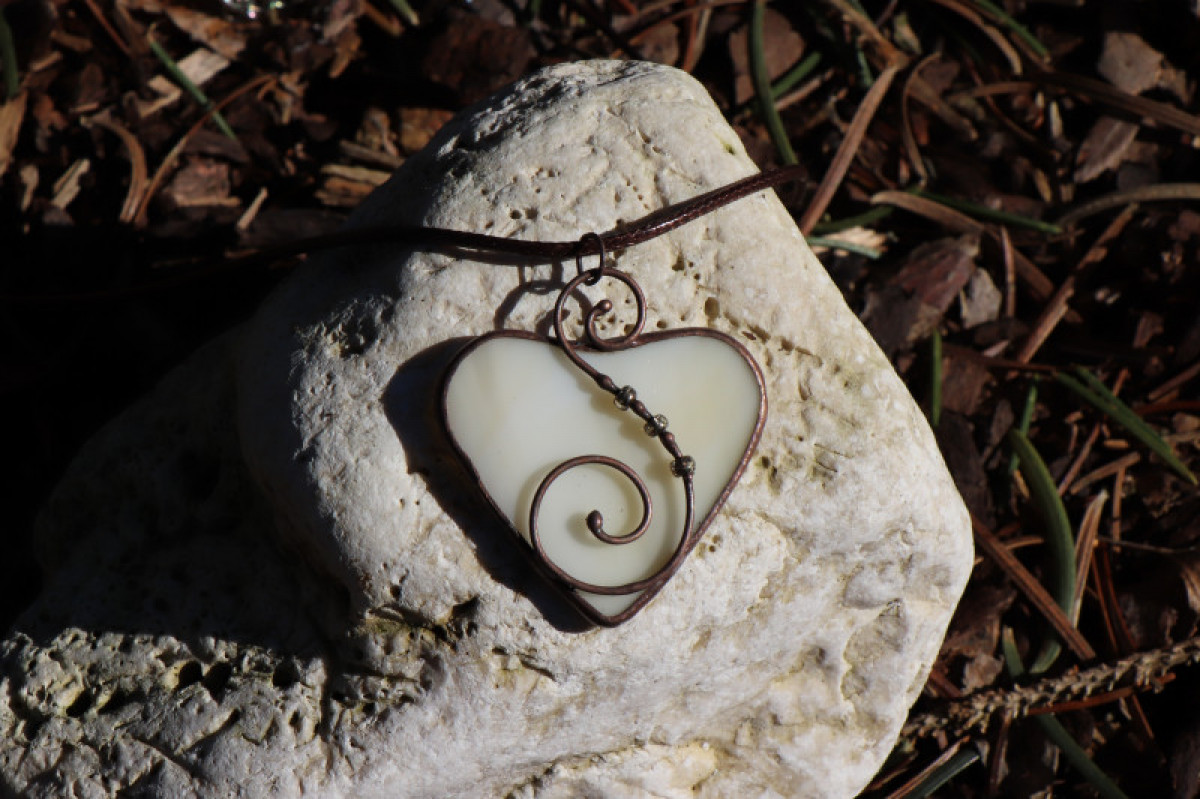 Náhrdelník je zhotoven tiffany technikou z opálového béžového skla. Sklo je obroušeno, pocínováno a ozdobeno drátkem a korálky. Nakonec je celý šperk opatřen hnědou patinou a antioxidačním nátěrem.