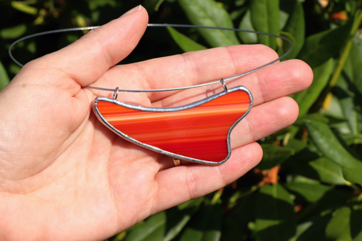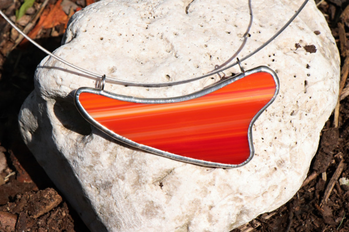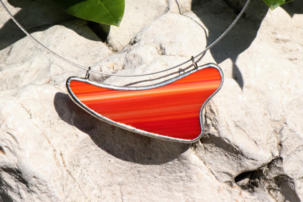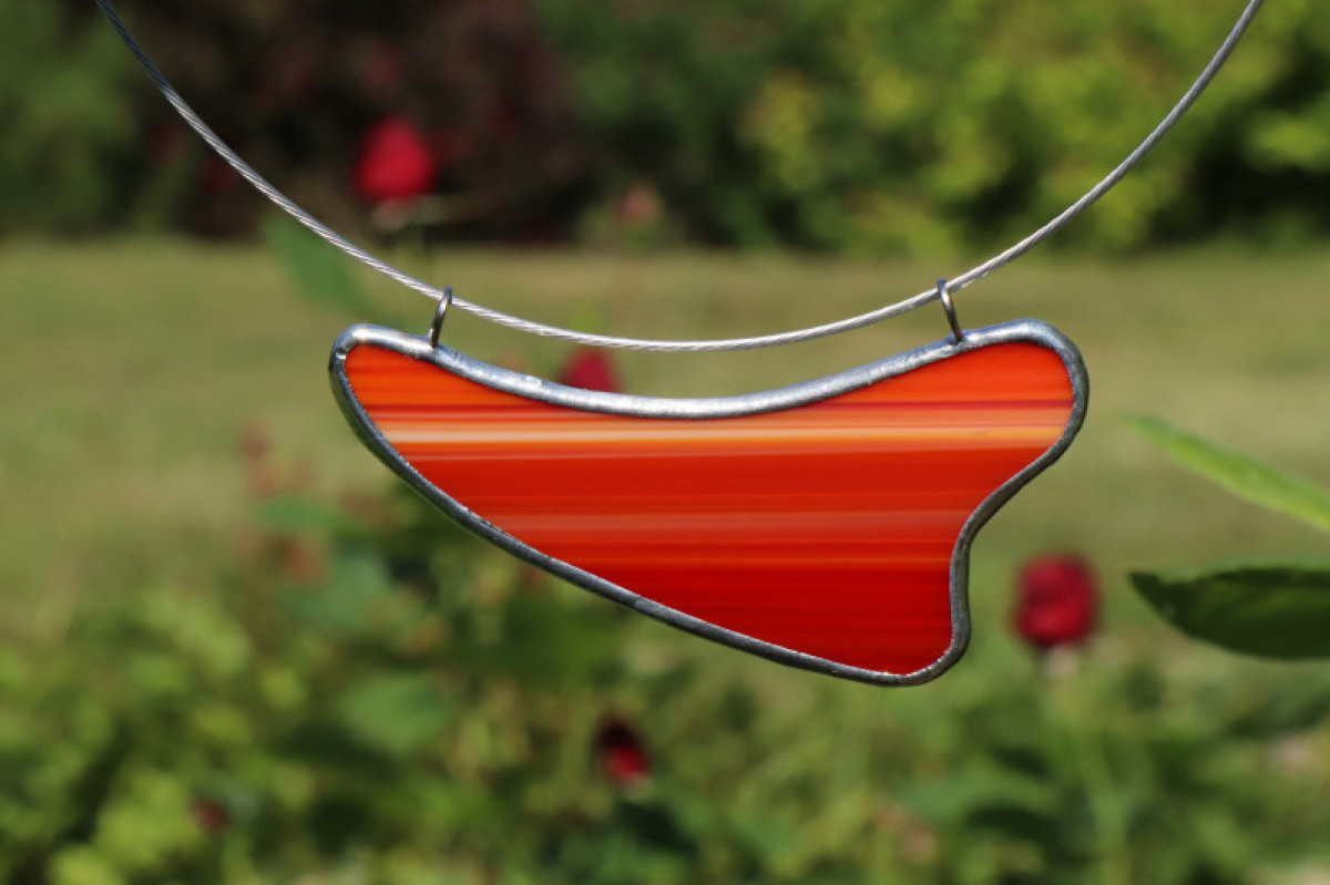Náhrdelník je zhotoven tiffany technikou z opálového červeného pruhovaného skla. Sklo je obroušeno, ocínováno a nakonec je celý šperk opatřen antioxidačním nátěrem.