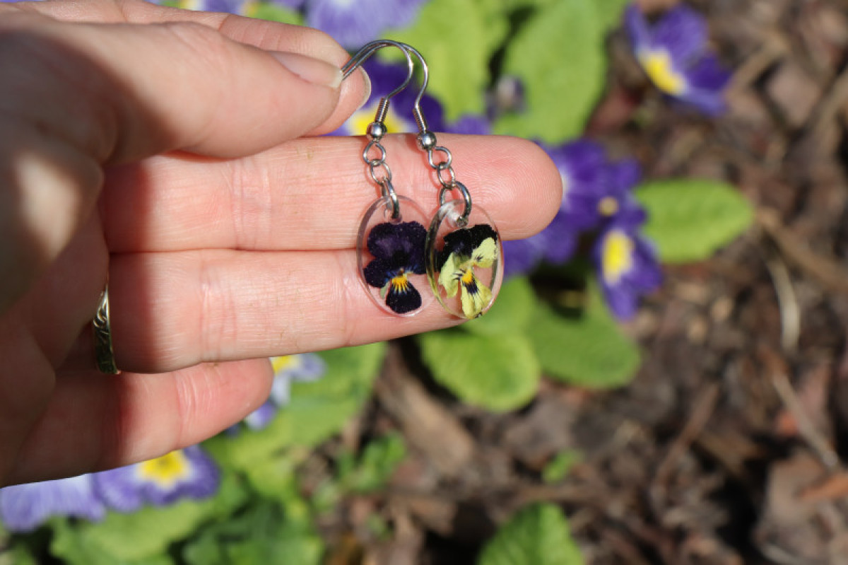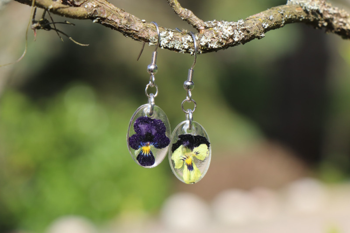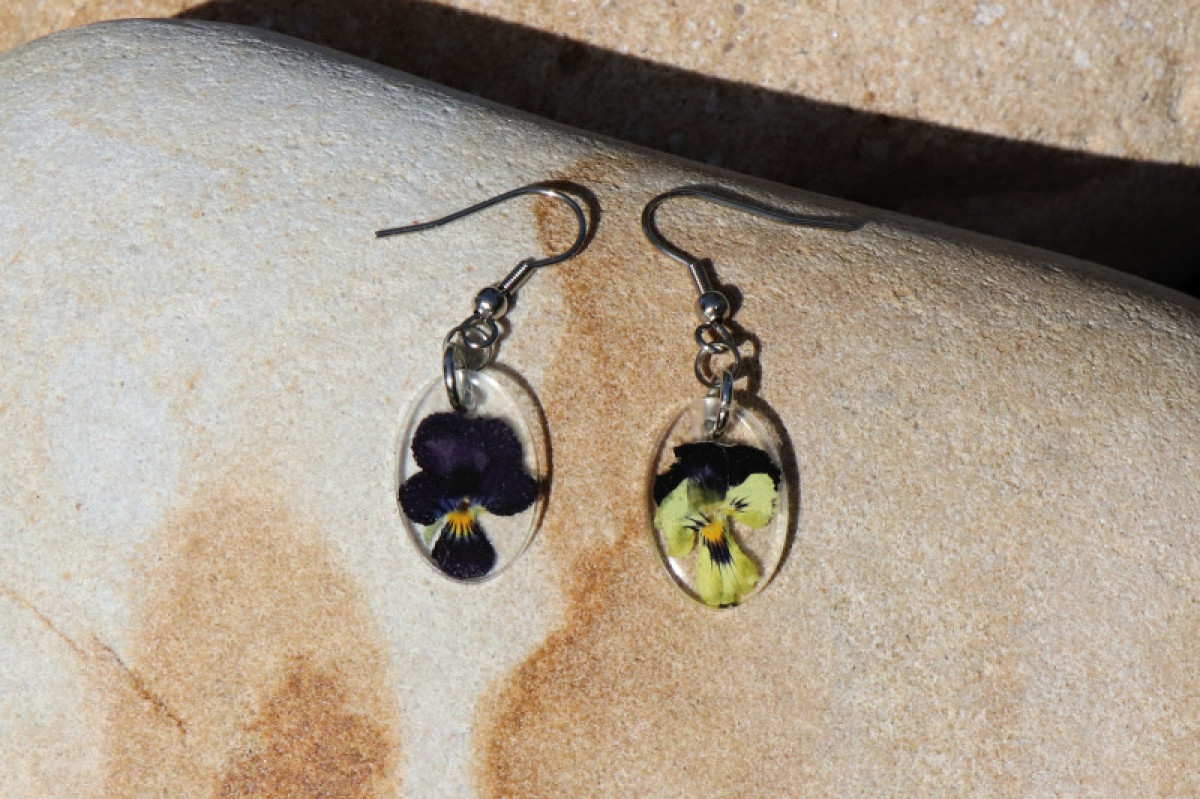 Sušené květy violky jsou zality křišťálovou pryskyřicí. Originální a jedinečný šperk - pouze 1 kus.