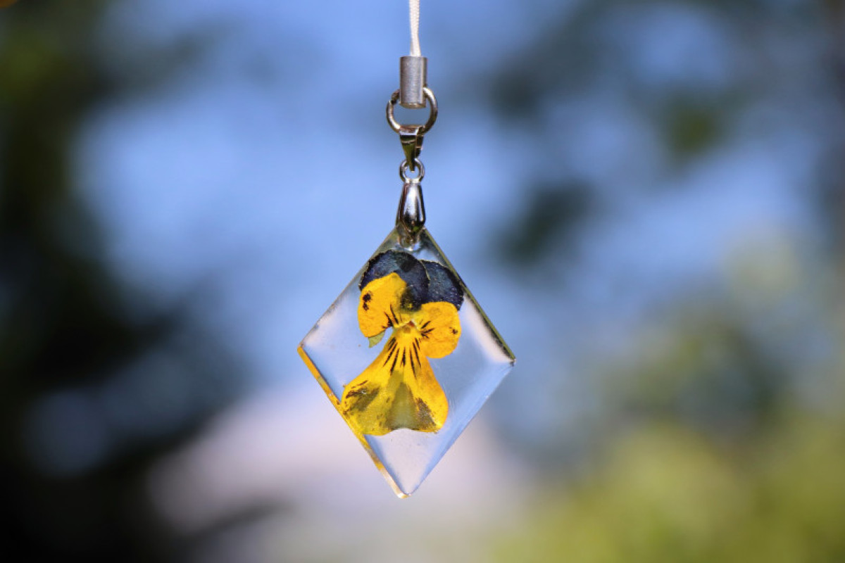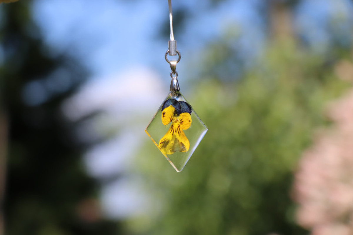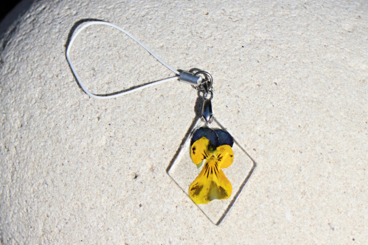 Přívěsek na klíče z květu violky zalitý křišťálovou pryskyřicí. Originální, veselý, lehký a jedinečný přívěsek.