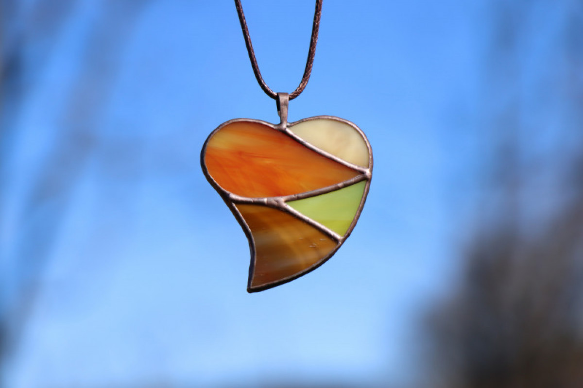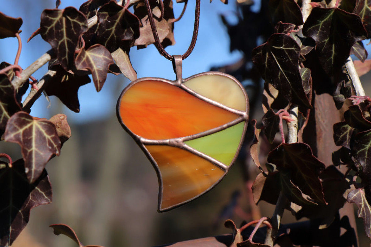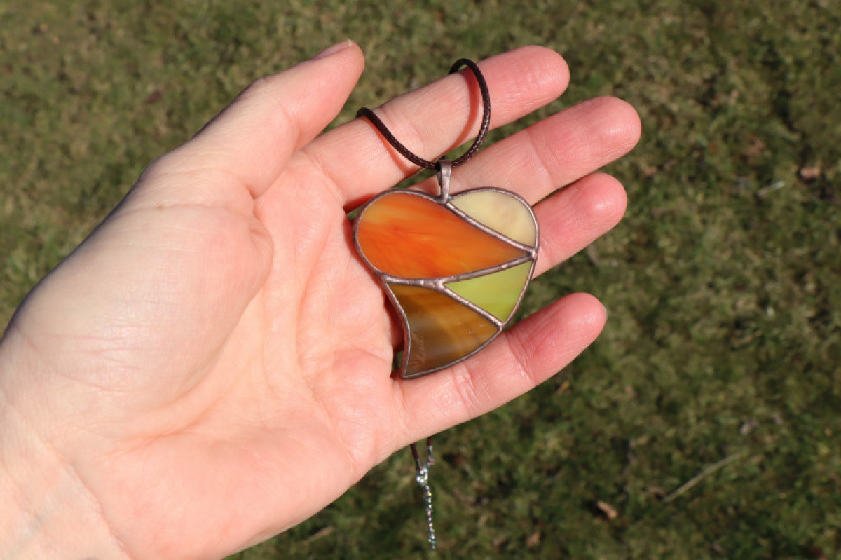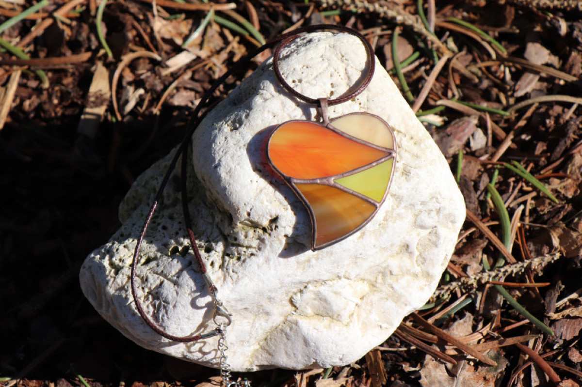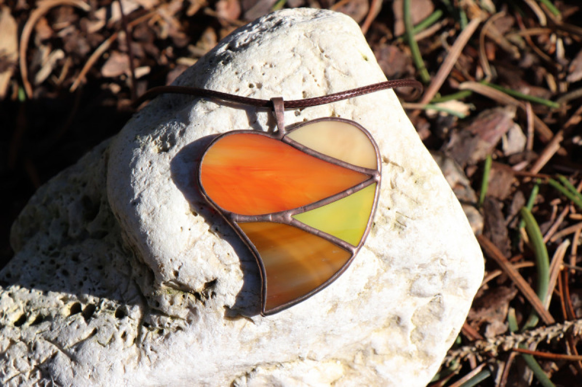 Náhrdelník je zhotoven tiffany technikou z opálových béžových, oranžových a žlutých skel. Sklíčka jsou v barvách teplých tónů - béžová, oranžová a žlutá. Jednotlivá sklíčka jsou spojena cínem a opatřena nátěrem z hnědé patiny. Nakonec je celý šperk ošetřen antioxidantem.