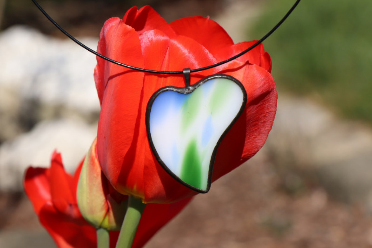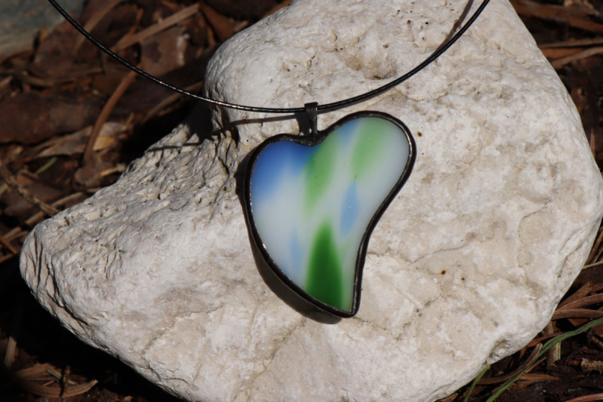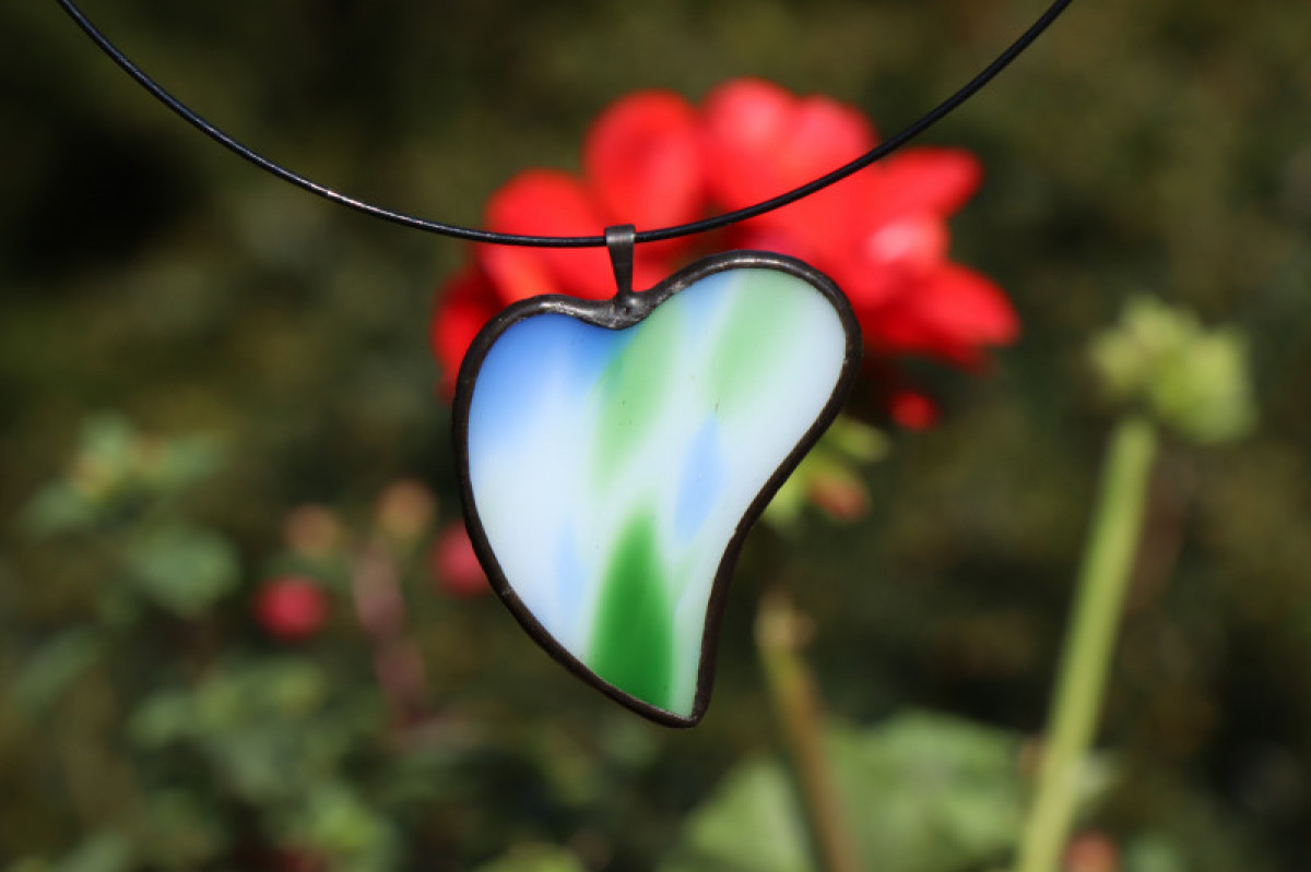 Tiffany náhrdelník - žíhané modrozelenobílé srdce