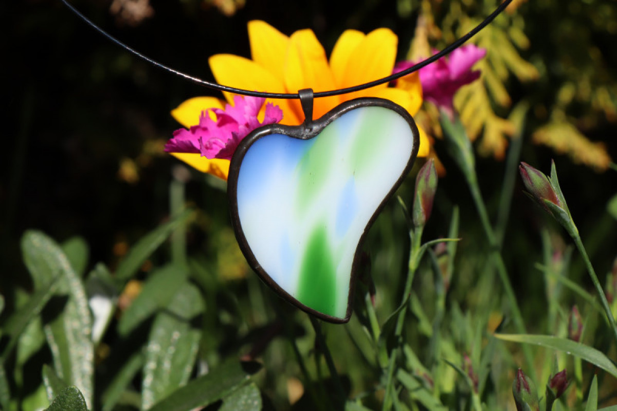Náhrdelník je zhotoven tiffany technikou z opálového žíhaného skla. Sklo je obroušeno a pocínováno a nakonec je celý šperk opatřen nátěrem z černé patiny. Každý šperk z tohoto barevného skla je trochu jiný podle žíhanosti skla a proto je každý jedinečný.