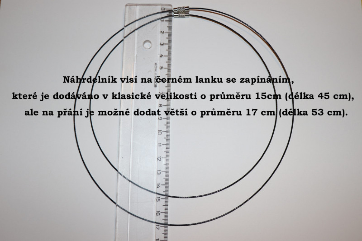 Náhrdelník visí na černém lanku se zapínáním, které je dodáváno v klasické velikosti o průměru 15cm (délka 45 cm), ale na přání je možné dodat větší o průměru 17 cm (délka 53 cm) - viz poslední foto u produktu. Lanko je možné vyměnit za černou povoskovanou šňůrku se zapínáním.